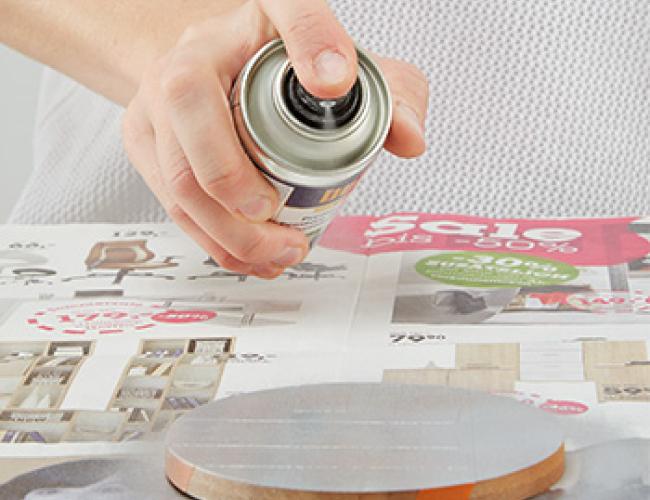 Na początku wykonamy dowolny wzór na tacy i porządnie go przykleimy. W zależności od używanego rodzaju farby nałóż pędzel lub spray.