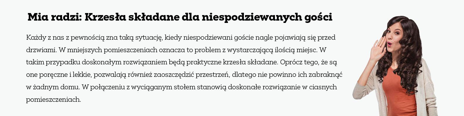 Kompaktowe, mobilne, praktyczne – krzesła składane są bardzo dobrym rozwiązaniem przede wszystkim w małych pomieszczeniach mieszkalnych. W mgnieniu oka rozłożysz je tam, gdzie będą potrzebne. Ponadto mogą stanowić ciekawe elementy ozdobne na ścianie, a przy większej ilości gości zapewniają dodatkowe miejsca do siedzenia.